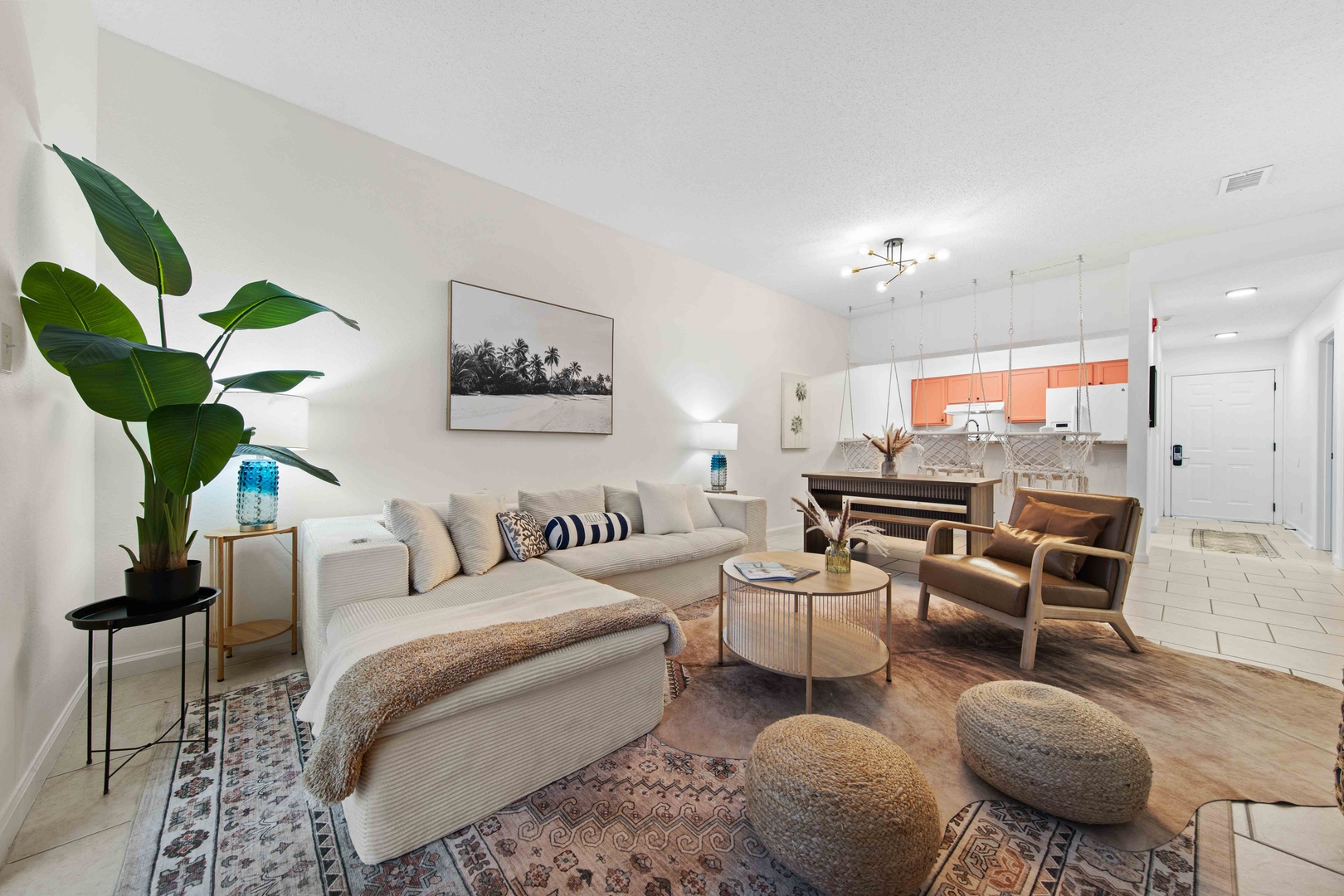 Welcome to your peaceful perch above it all -Yes can you craft the neighborhood? a third-floor condo designed for easygoing luxury and boho vibes. From the moment you walk in, you’re met with soft natural light, thoughtful décor, and a welcoming sense of space. The kitchen features granite counters, modern appliances, and a unique hanging boho breakfast bar perfect for a casual morning meal. A round dining table adds extra seating for shared dinners or a quick laptop session.